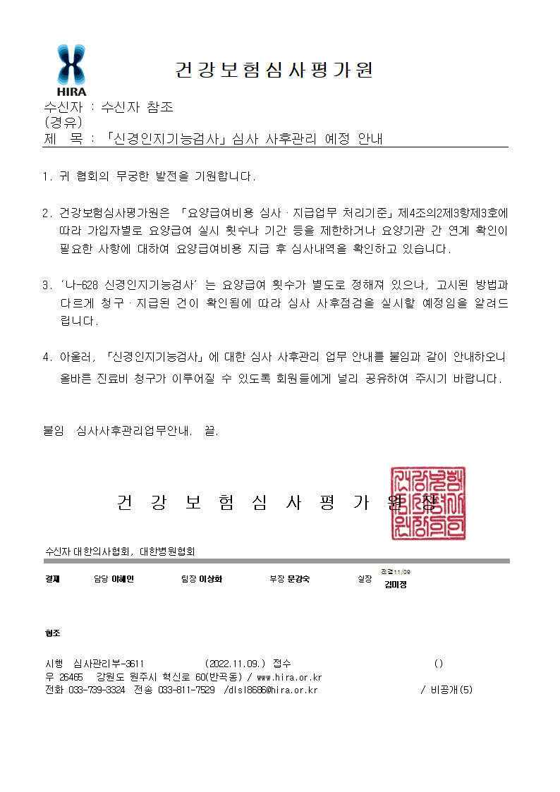 2. 위 호 관련, 건강보험심사평가원에서 「신경인지기능검사」심사 사후관리 예정임을 안내하여 왔습니다. (※ 「요양급여비용 심사·지급업무 처리기준」