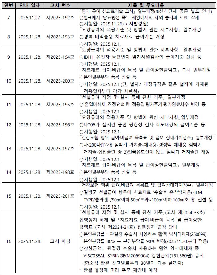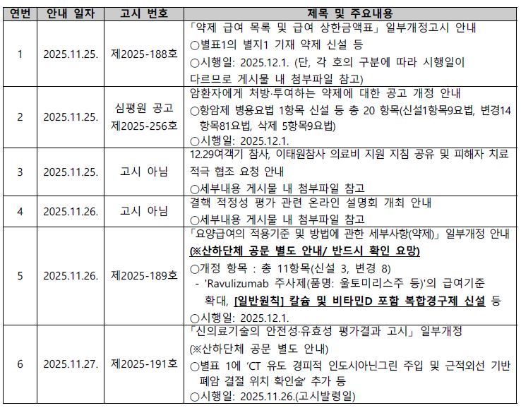 2. 이에, 2025년 11월 24일 ~ 11월 30일까지 「대한의사협회 홈페이지(www.kma.org) > 공지·뉴스> 건강보험 고시 안내」에