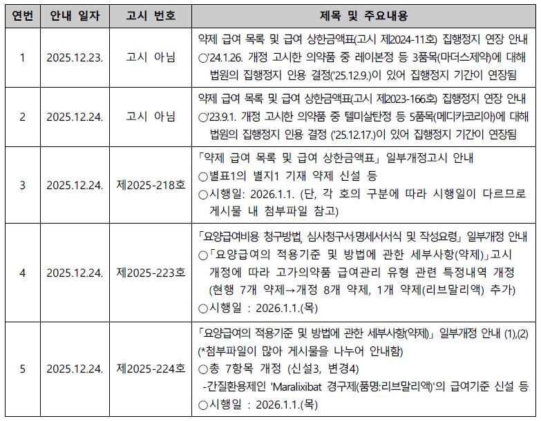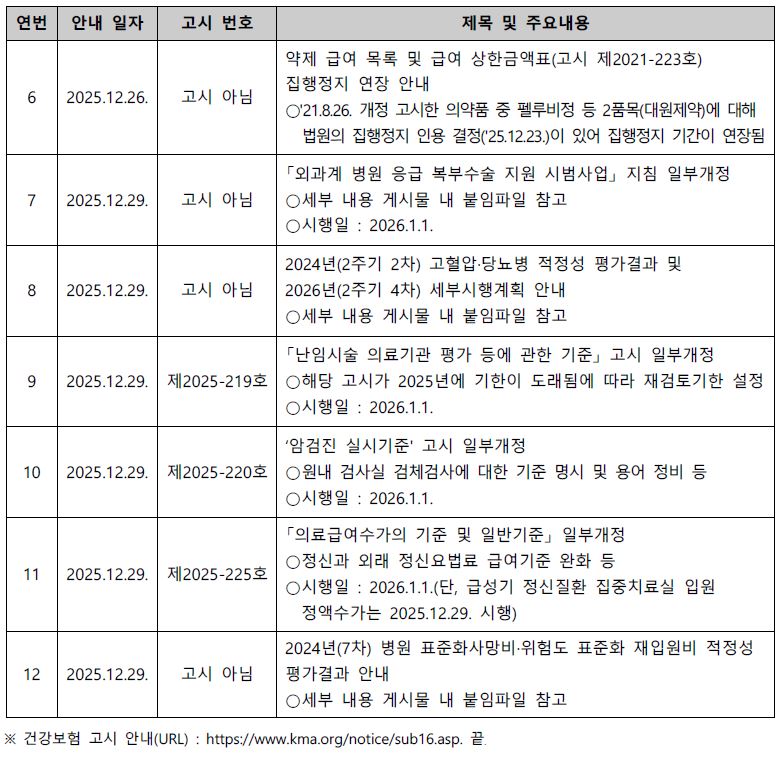 2. 이에, 2025년 12월 22일 ~ 12월 29일까지 「대한의사협회 홈페이지(www.kma.org) > 공지·뉴스> 건강보험 고시 안내」에 게시된 고시 관련사항을 다음과 같이