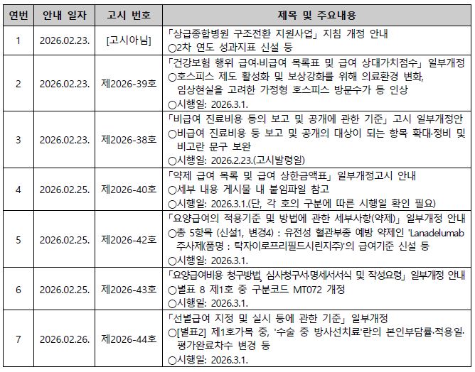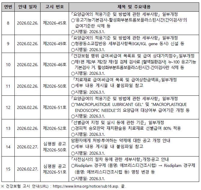2. 이에, 2026년 2월 23일 ~ 3월 1일까지 「대한의사협회 홈페이지(www.kma.org) > 공지·뉴스 >건강보험 고시 안내」에
