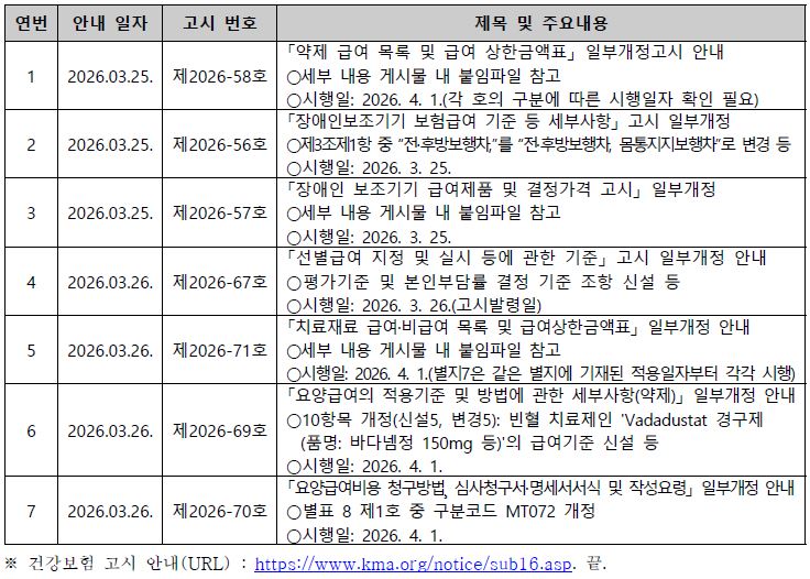 2. 이에, 2026년 3월 23일 ~ 3월 29일까지 「대한의사협회 홈페이지(www.kma.org)> 공지·뉴스 > 건강보험 고시 안내」에 게시된 고시 관련사항을