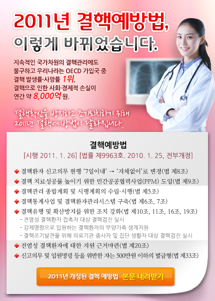 2. 질병관리본부에서는 지속적인 국가차원의 결핵관리에도 불구하고 결핵환자 발생의 감소속도 둔화와 다제내성 결핵환자의 증가 등 결핵으로부터 국민의 건강과 생명을 지키기 위해 제도 전반의 개선 및 보완이 필요함에 따라 2011년 결핵예방법이 개정(2011.1.26. 시행)되었음을 알려온 바,