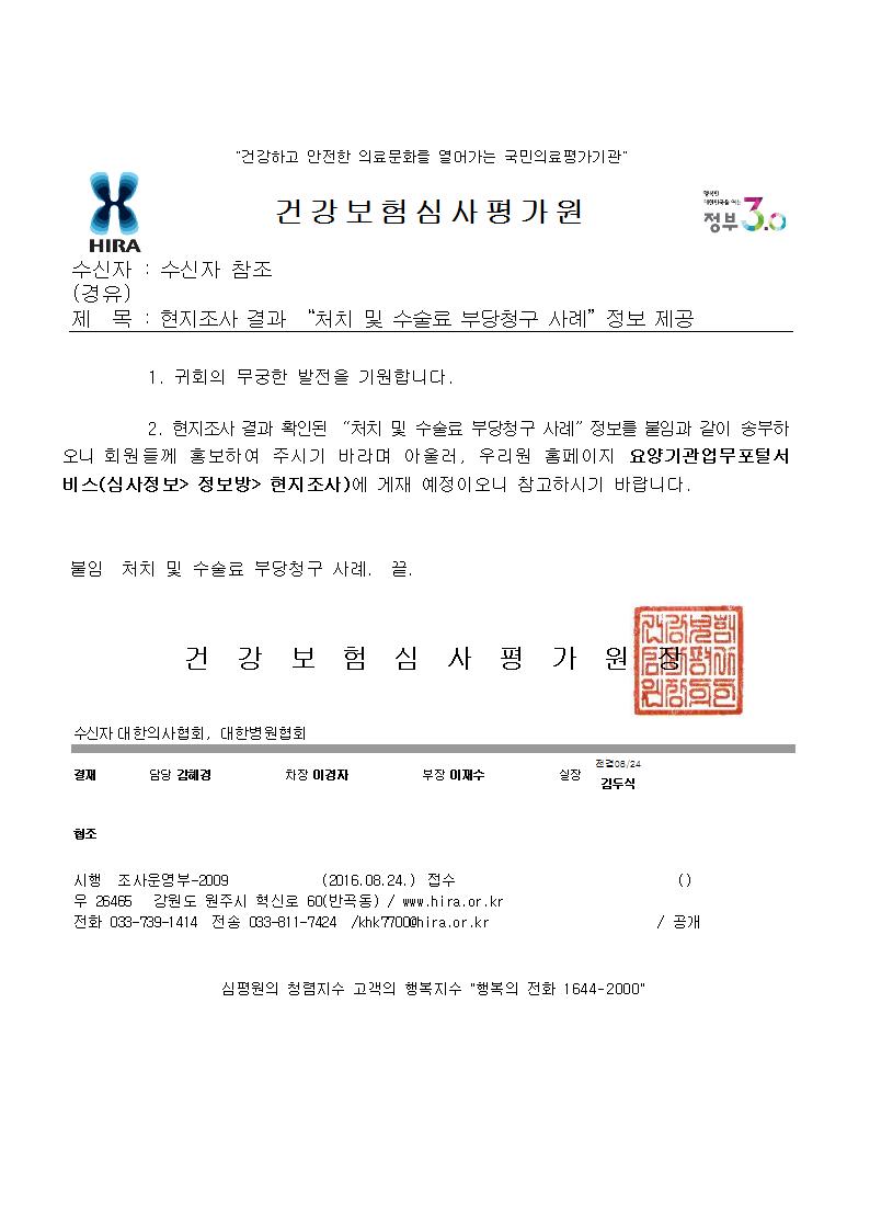 학회공지 현지조사결과 ‘처치 및 수술료 부당청구 사례 정보제공 자료 송부의 건 작성자 : 대한결핵및호흡기학회 조회수 : 148 게시일 : 2016-09-13 1. 건강보험심사평가원 조사운영부 2009 " 현지조사결과 '처치 및 수술료 부당청구 사례 "정보제공" 관련 입니다. 2. 상기와 관련 건강보험심사평가원에서 보건복지부 현지조사결과 '처치 및 수술료 부당청구사례"를 붙임과 같이 송부하여온 바, 이를 안내하오니 관련 업무에 참고하여 주시기 바랍니다. * 붙임 : 관련문서 사본 1부.끝. 현지조사결과 “처치 및 수술료 부당청구 사례”정보 제공-160829.jpg (다운로드 : 121회) 처치 및 수술료 부당청구사례-160829.hwp (다운로드 : 135회) 목록