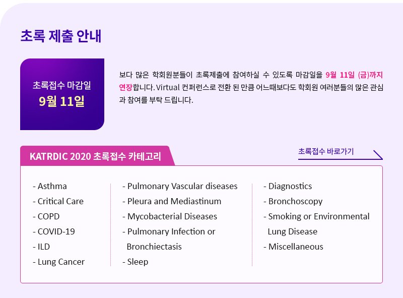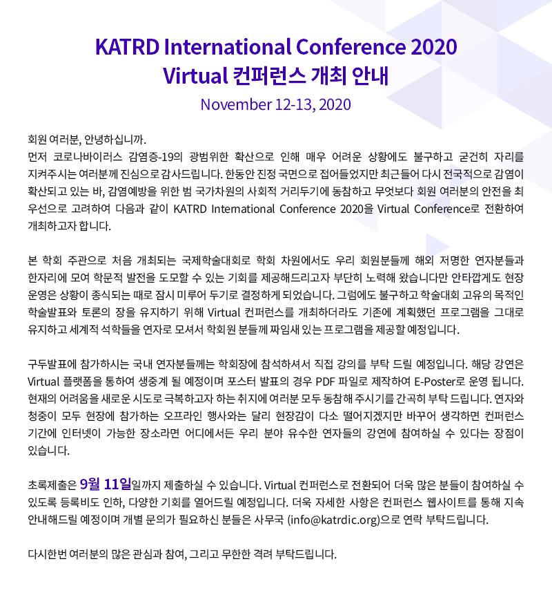 학회공지 KATRDIC 2020 Newsletter Vol. 2 버추얼 컨퍼런스 개최 안내(초록제출마감 : 9월 11일) 작성자 : 대한결핵 및 호흡기학회 조회수 : 696 게시일 : 2020-08-04 http://www.katrdic.org ::: KATRDIC 2020 ::: 목록