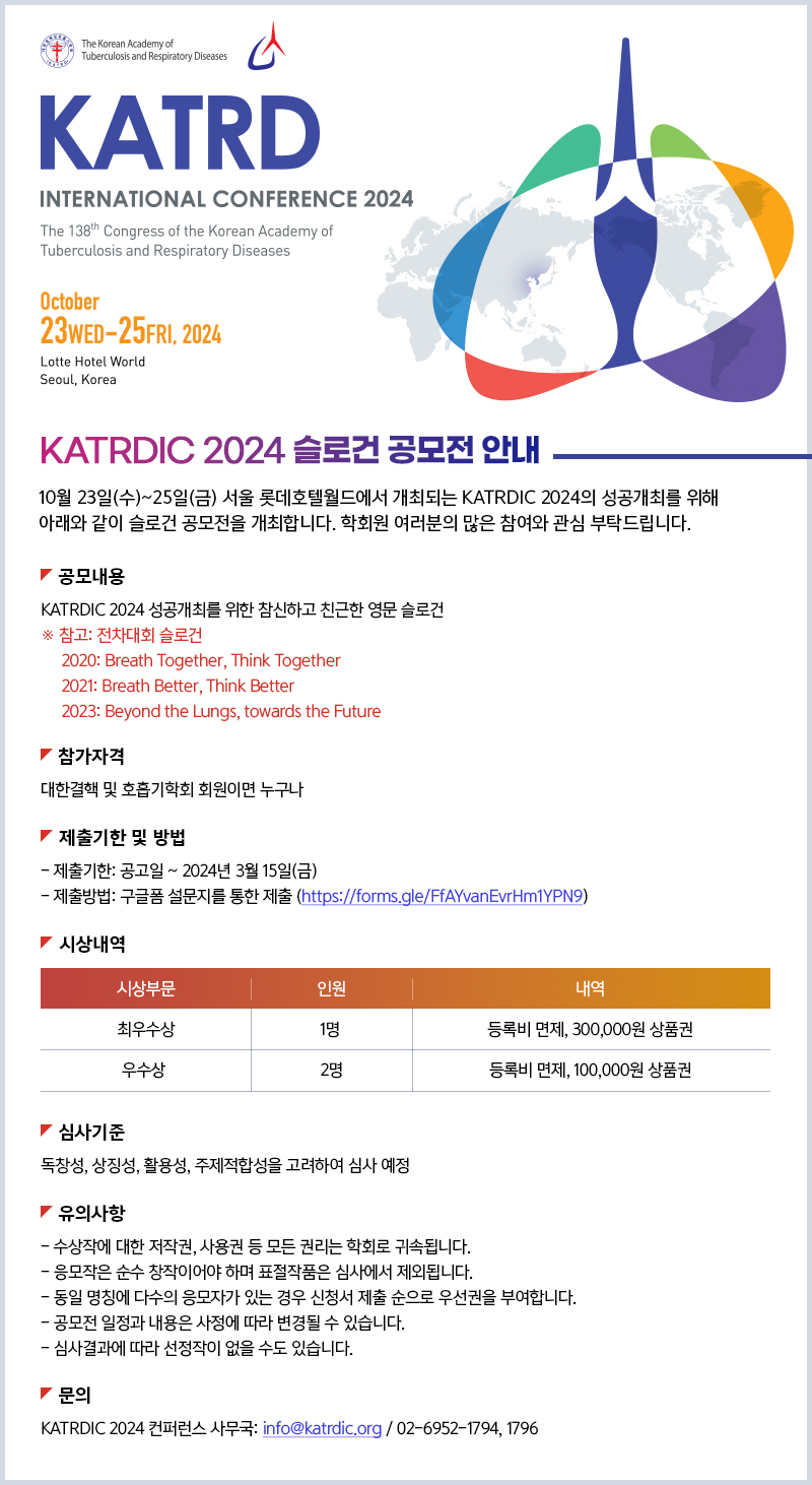 학회공지 [KATRDIC 2024] 슬로건 공모전 안내 (3월 15일 금요일까지) 작성자 : 엠투커뮤니티 조회수 : 3,049 게시일 : 2024-02-28 http:// ::::: KATRDIC 2024 ::::: Having trouble viewing this email? Click here to see it on-line. 목록
