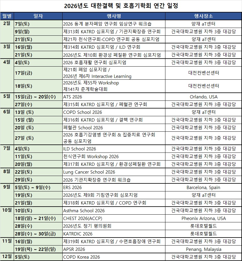 학회공지 2026년도 대한결핵 및 호흡기학회 연간 일정 안내 작성자 : 대한결핵 및 호흡기학회 조회수 : 620 게시일 : 2025-12-11 학회원 여러분 안녕하십니까 2026년도 대한결핵 및 호흡기학회 연간 일정을 안내드립니다. 추후 자세한 일정 및 변경사항은 학회 홈페이지 "학술행사" 메뉴를 참고하시기 바랍니다. 목록