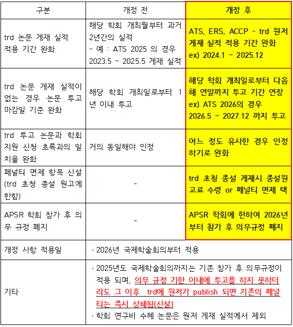학회공지 “국제학술회의 참가 후 의무 규정” 개정 안내 (2026년도부터 적용) 작성자 : 대한결핵 및 호흡기학회 조회수 : 150 게시일 : 2025-12-23 학회원 안녕하십니까 본 학회에서는 2025년도 제6차 이사회(10/20)에서 학회원의 국제학술회의 참석을 적극적으로 지원하고자 아래와 같이 “참가 후 의무 규정“을 개정하여 안내하오니 업무에 참고하시기 바랍니다. ※ 국제학술회의 참가 후 의무 규정 개정 사항 기타 문의사항은 학회 사무국으로 연락주시기 바랍니다. 감사합니다. 목록
