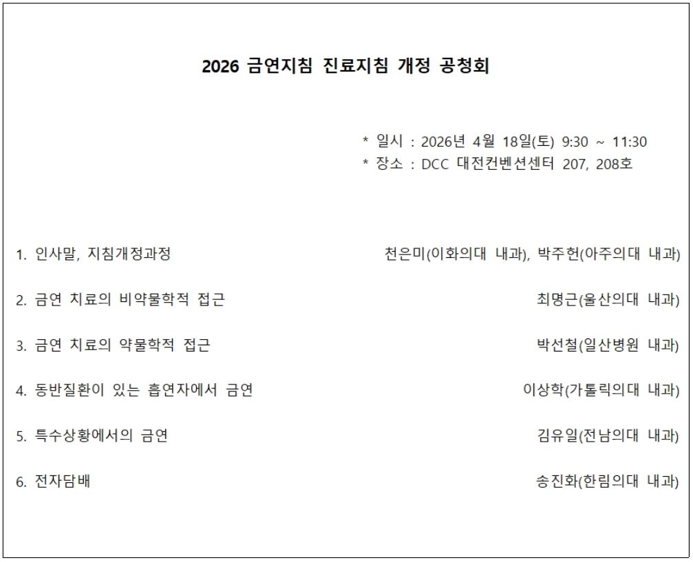 금번 춘계학회에서는 이러한 내용을 바탕으로 ‘개정된 금연 지침’에 대한 공청회를 개최하고자 합니다.