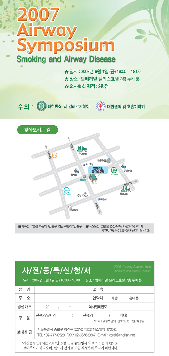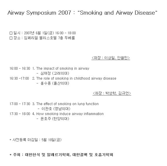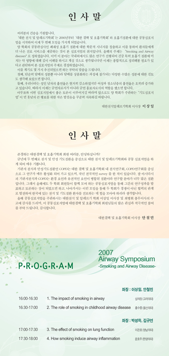 학회공지 2007 Airway Symposium : Smoking and Airway Disease 작성자 : 관리자 조회수 : 2,359 게시일 : 2007-04-26 . 1189166150_사전등록신청서2007Airway.hwp (다운로드 : 88회) 1189166150_2007Airwayinvitform2.jpg (다운로드 : 83회) 1189166150_2007Airwayinvitform.jpg (다운로드 : 74회) 1189166150_2007AirwayPoster.jpg (다운로드 : 97회) 1189166150_2007Airwayinvit.jpg (다운로드 : 116회) 목록