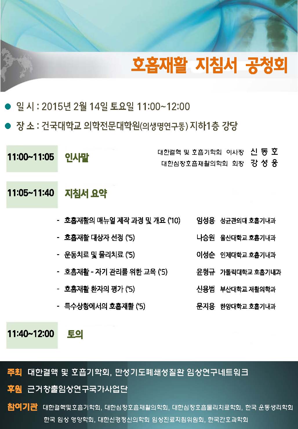 학회공지 "호흡재활 지침서 공청회" 개최 안내 작성자 : 대한결핵 및 호흡기학회 조회수 : 1,246 게시일 : 2015-01-21 http:// . 1421829617_프로그램(1).jpg (다운로드 : 164회) 목록