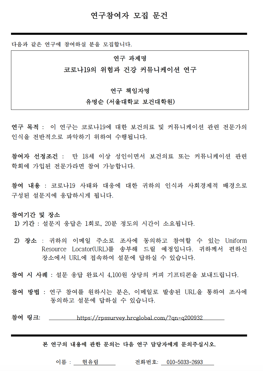 1. 한국헬스커뮤니케이션학회에서는 코로나 19 관련 전문가의 인식을 파악하고자, 온라인 설문조사를 시행한다고 합니다.