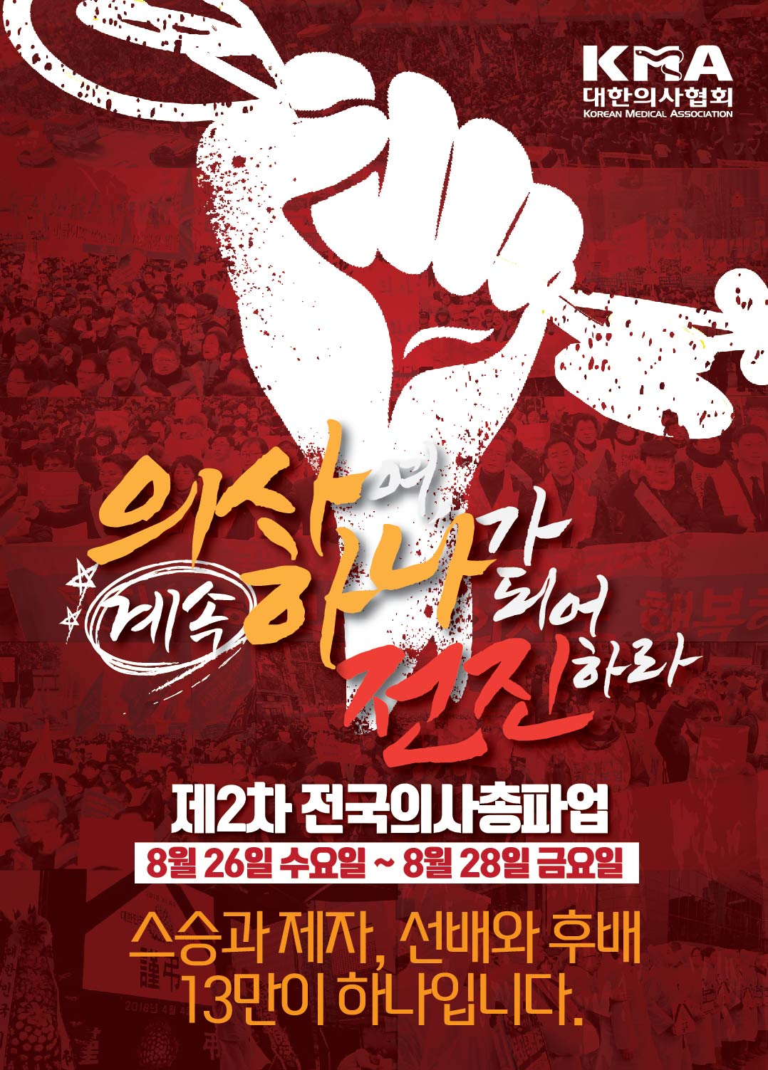 학회공지 제2차 전국의사총파업 관련 안내사항 발송의 건 작성자 : 대한결핵 및 호흡기학회 조회수 : 65 게시일 : 2020-08-25 문서번호 : 대의협 제1811-06241(2020.8.21.) 정부의 4대악 의료정책 등 우리나라 의료의 총체적 위기상황에서 의료계를 위해 헌신하시는 귀회의 노고에 감사드립니다. 8월 26일~28일 3일간 진행될 제2차 전국의사총파업 관련 안내사항을 첨부하오니 업무에 참고하시기 바랍니다. [대의협1811-06241] 제2차 전국의사총파업 지침 안내-200821(대의협 제1811-06241).pdf (다운로드 : 58회) [붙임] 제2차 전국의사총파업 관련 안내사항-200821(대의협 제1811-06241).hwp (다운로드 : 21회) 전략홍보국-홍보팀-붙임1-대회원 포스터2-200820(대의협 제471-6168호).jpg (다운로드 : 19회) 목록