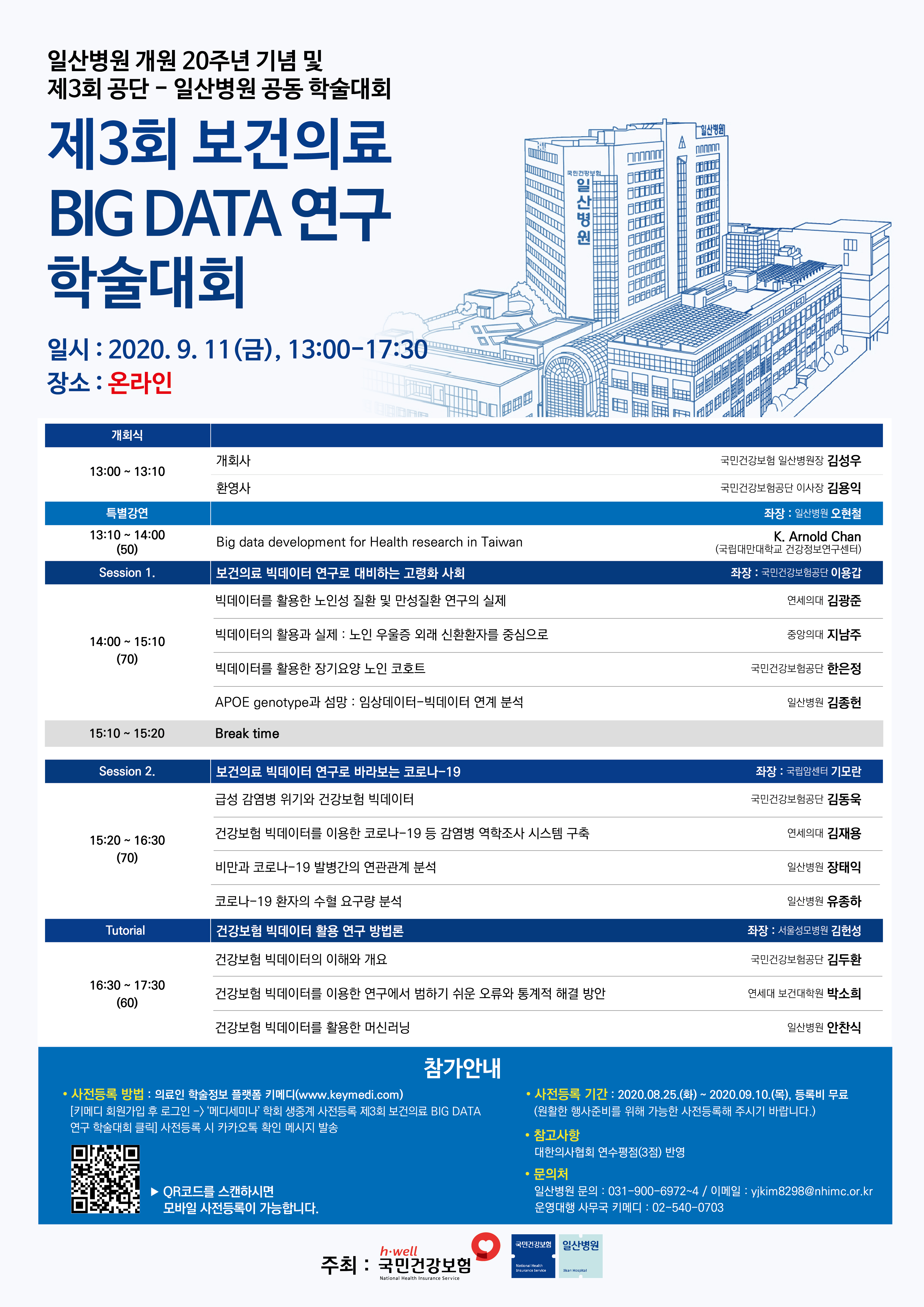 국민건강보험공단과 일산병원은 빅데이터 연구를 통한 건강보험 제도 발전과 정책활용성 제고 방안을 모색하고자 『제3회 보건의료 BIG DATA 연구 학술대회』를 정기 개최하고 있습니다. 특히 이번 학술대회는 코로나19 감염예방을 위해 온라인 학술대회로 진행하고자 하오니 많은 참여와 관심 부탁드립니다.