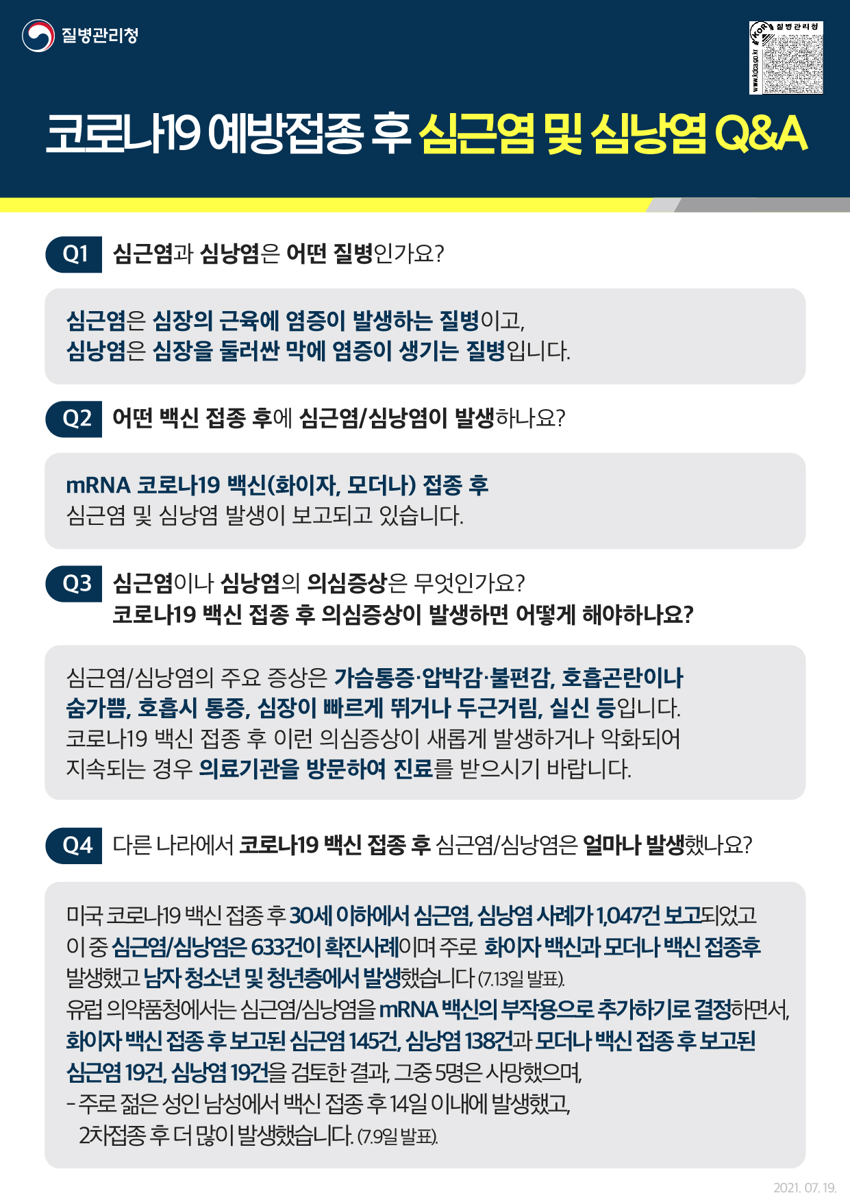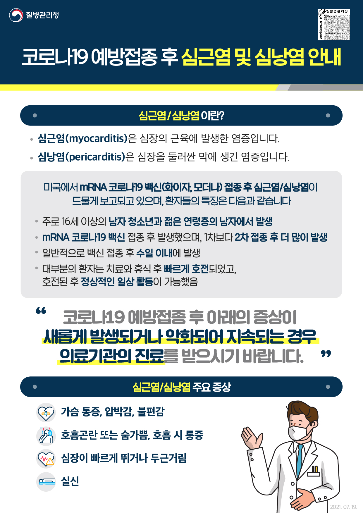 2. 코로나19 예방접종대응추진단에서는 mRNA 코로나19 백신(화이자, 모더나) 접종 관련, mRNA 백신 접종 후 심근염 · 심낭염 관련 자료(안내서, 포스터, 동영상 등) 및
