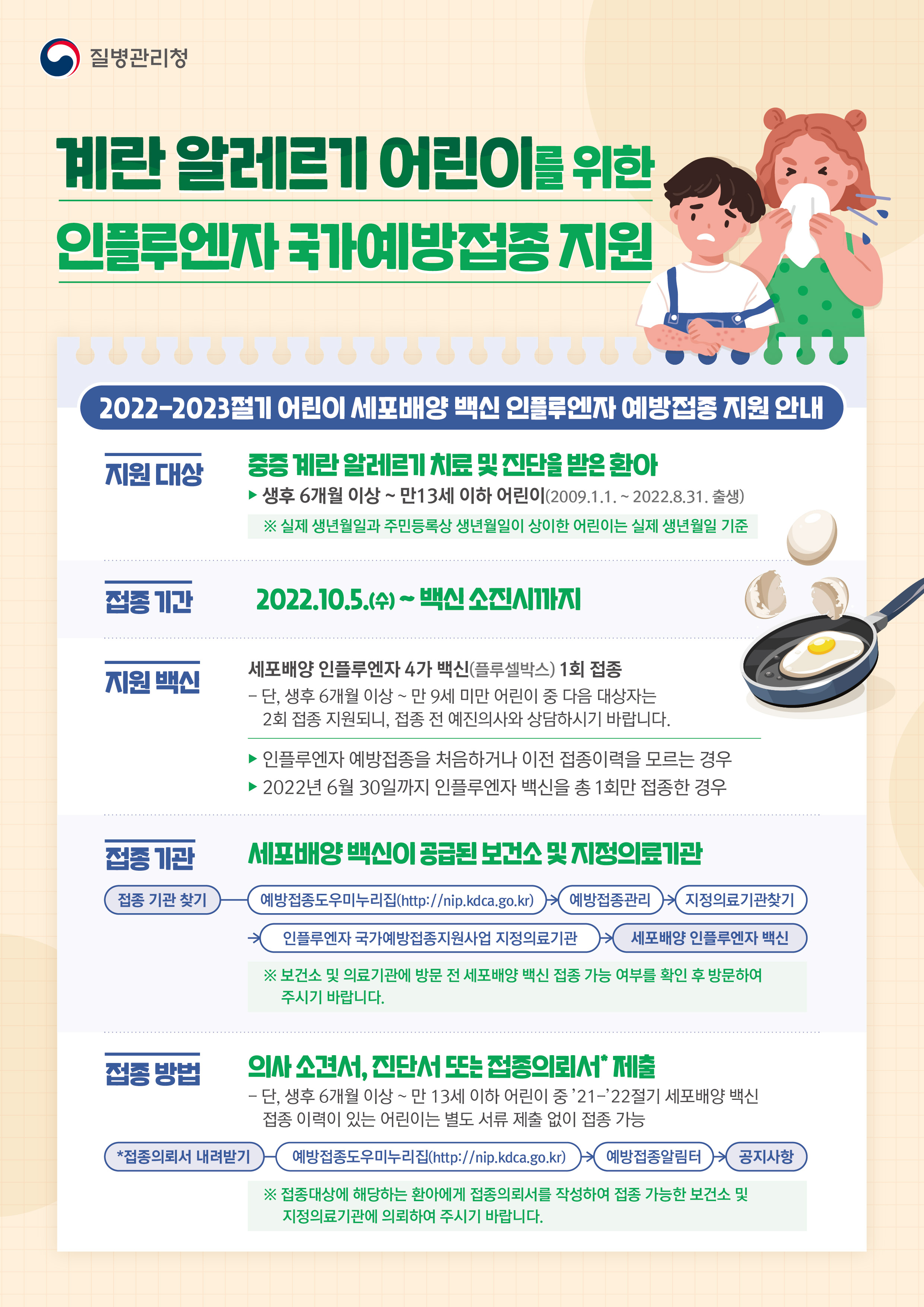 가. 접종 대상 : 생후 6개월 이상~만 13세 이하 어린이 중 계란 아나필락시스 및 중증 계란 알레르기 환자