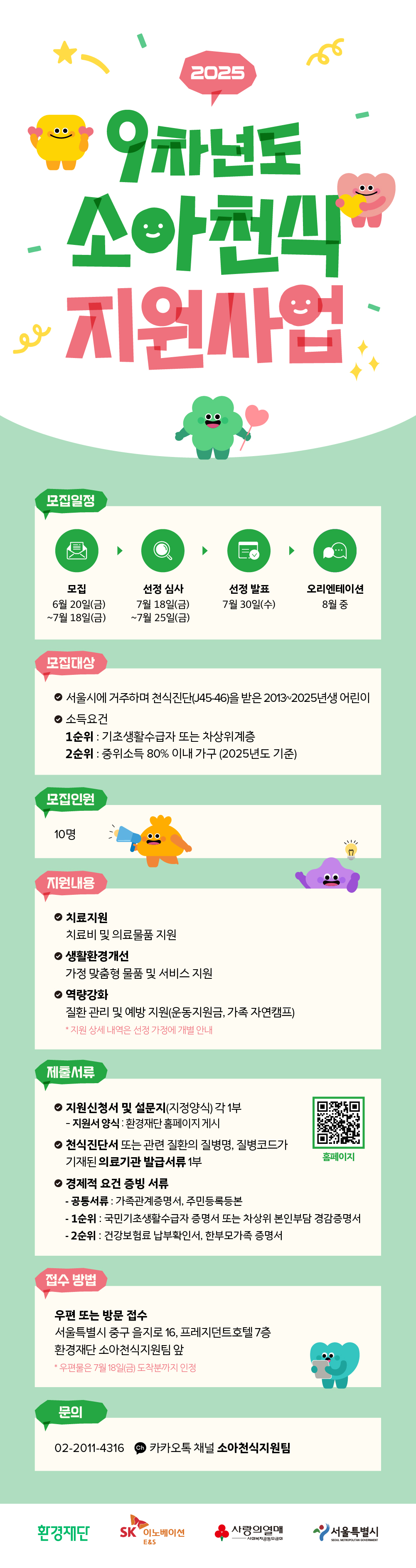 가. 사업명 : 2025 소아천식 지원사업(9차년도) 나. 모집기간 : 2025년 6월 20일(금) ~ 7월 18일(금) 다. 모집대상 : ① 서울시에 거주하며 천식진단(J45-46)을 받은 2013~2025년생 어린이 ② 소득요건 - 1순위 : 기초생활수급자 또는 차상위계층 - 2순위 : 중위소득 80% 이내 가구(2025년 기준) 라. 지원기간 : 2025년 8월 ~ 2026년 6월(총 11개월) 마. 지원내용 : ① 치료 지원 : 치료비 및 의료물품 지원 ② 생활환경개선 : 가정 맞춤형 물품 및 서비스 지원 ③ 역량강화 : 질환 관리 및 예방 지원(운동지원금, 가족 자연캠프) 바. 문의 : 환경재단 소아천식지원팀 02-2011-4316 |