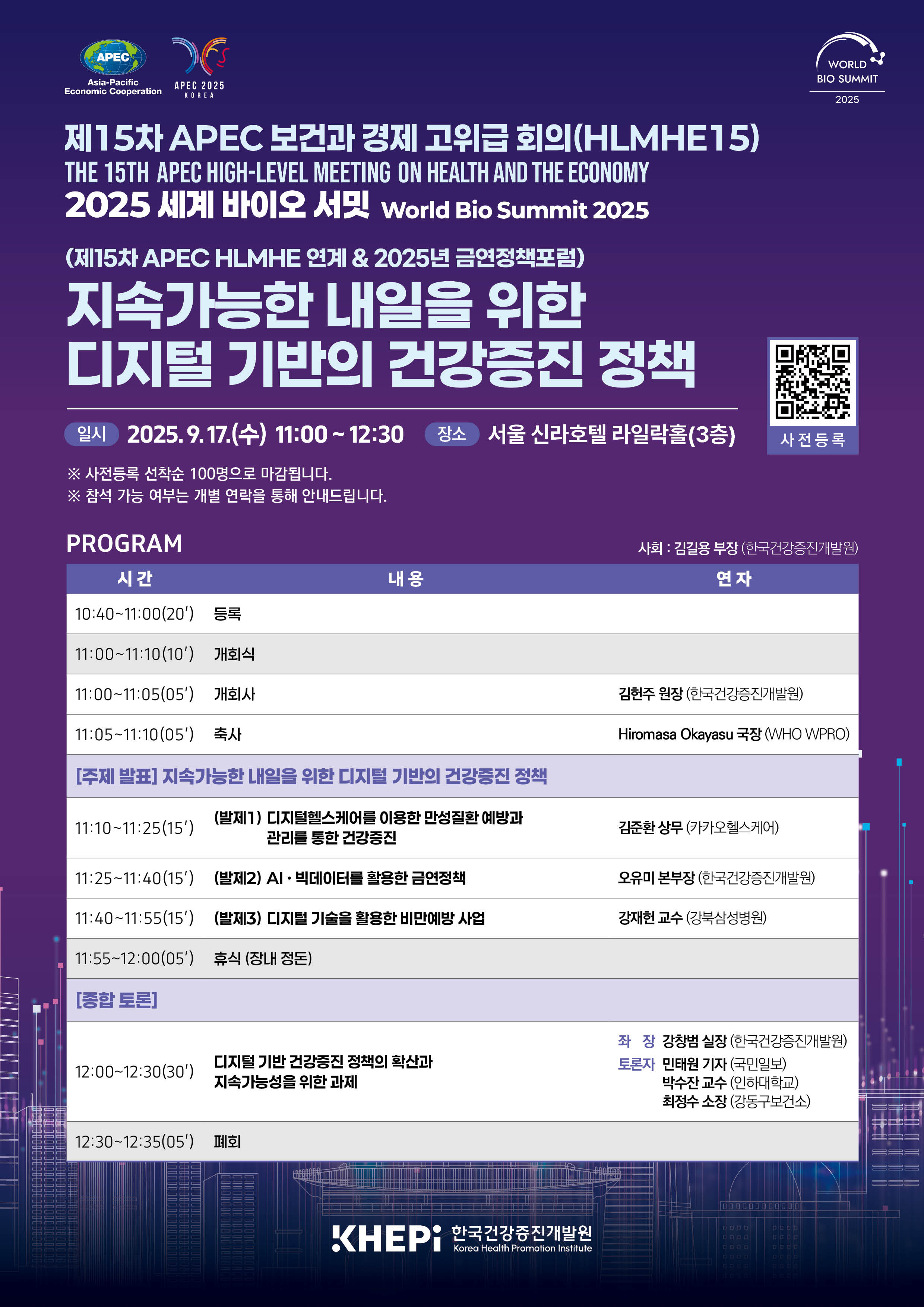 [제15회 APEC HLMHE 및 World Bio Summit 2025 개요] - (주제) ㆍAPEC HLMHE: 지속가능한 내일을 위한 모든 사람의 건강보장 ㆍWorld Bio Summit 2025: 혁신에서 접근으로: 모두를 위한 의료혁신 - (일시) '25. 9. 15(월) ~ 9. 17(수) - (장소) 서울 신라호텔 2층, 3층(APEC HLMHE 및 WBS25 메인 행사장) - (주관) 보건복지부(국제협력담당관실), APEC |