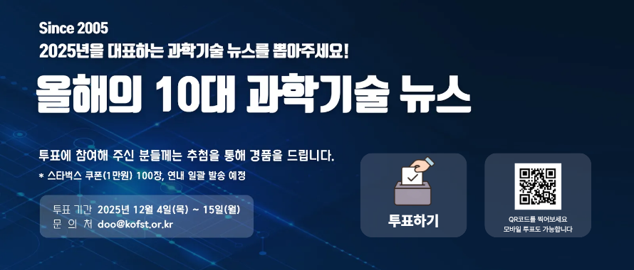 학회공지 2025년 「올해의 10대 과학기술 뉴스」 대국민 투표 안내 작성자 : 대한결핵 및 호흡기학회 조회수 : 28 게시일 : 2025-12-10 https://10news.kofst.or.kr 한국과학기술단체총연합회에서는 2005년부터 매년 한해의 과학기술 성과와 이슈를 조망하고, 최신 연구동향 파악 및 국민적 관심을 높여 과학대중화에 기여하고자 '올해의 10대 과학기술 뉴스'를 선정ㆍ발표해 오고 있습니다. 위와 관련하여, 2025년 '올해의 10대 과학기술 뉴스' 선정을 위한 대국민 투표 참여를 안내드리오니 업무에 참고하시기 바랍니다. 목록