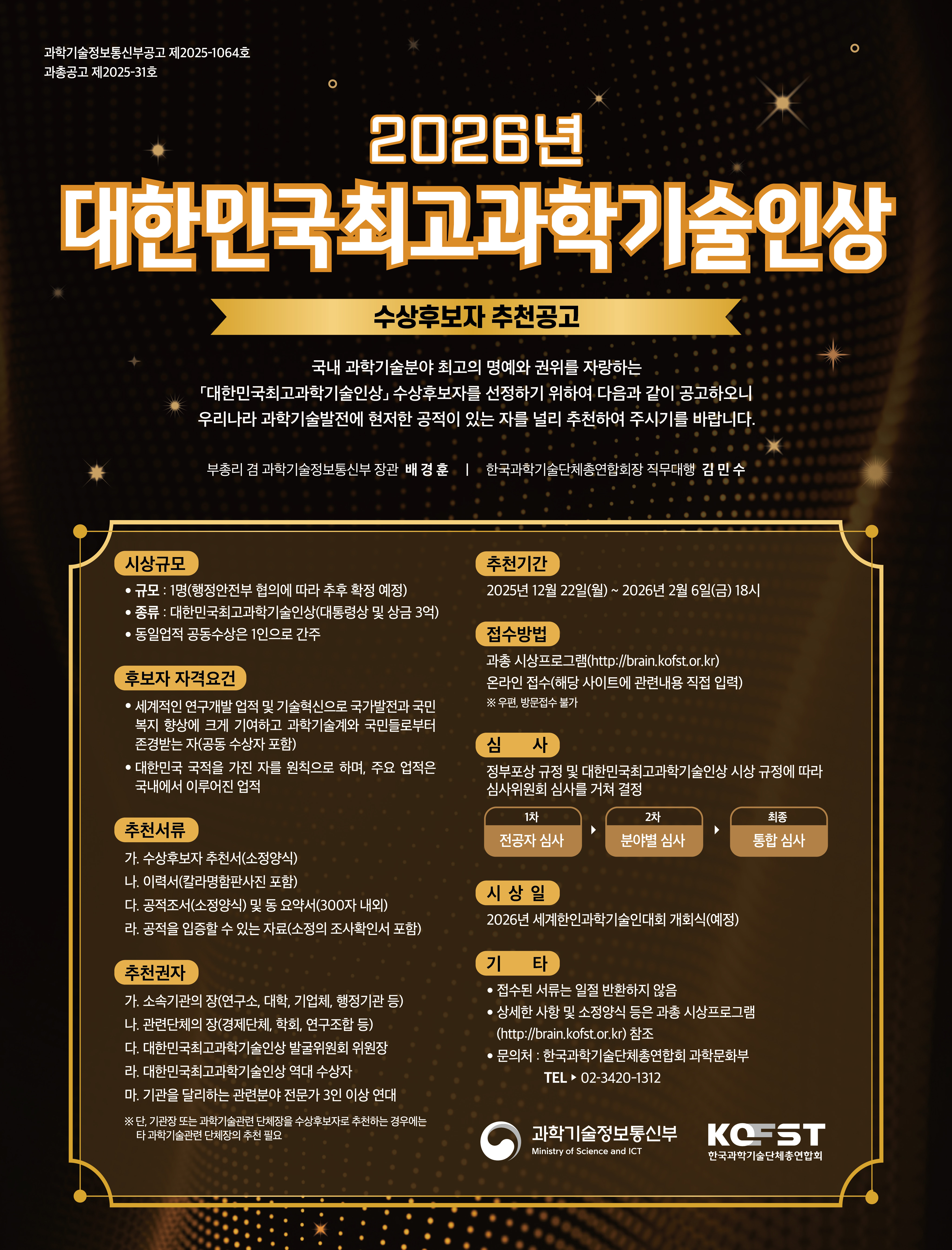 학회공지 [한국과학기술단체총연합회]2026년 대한민국최고과학기술인상 수상후보자 추천공고 작성자 : 대한결핵 및 호흡기학회 조회수 : 20 게시일 : 2026-01-12 2. 추천서 작성요령 및 서식.hwp (다운로드 : 10회) 1. 대한민국최고과학기술인상 개요.hwp (다운로드 : 10회) 목록