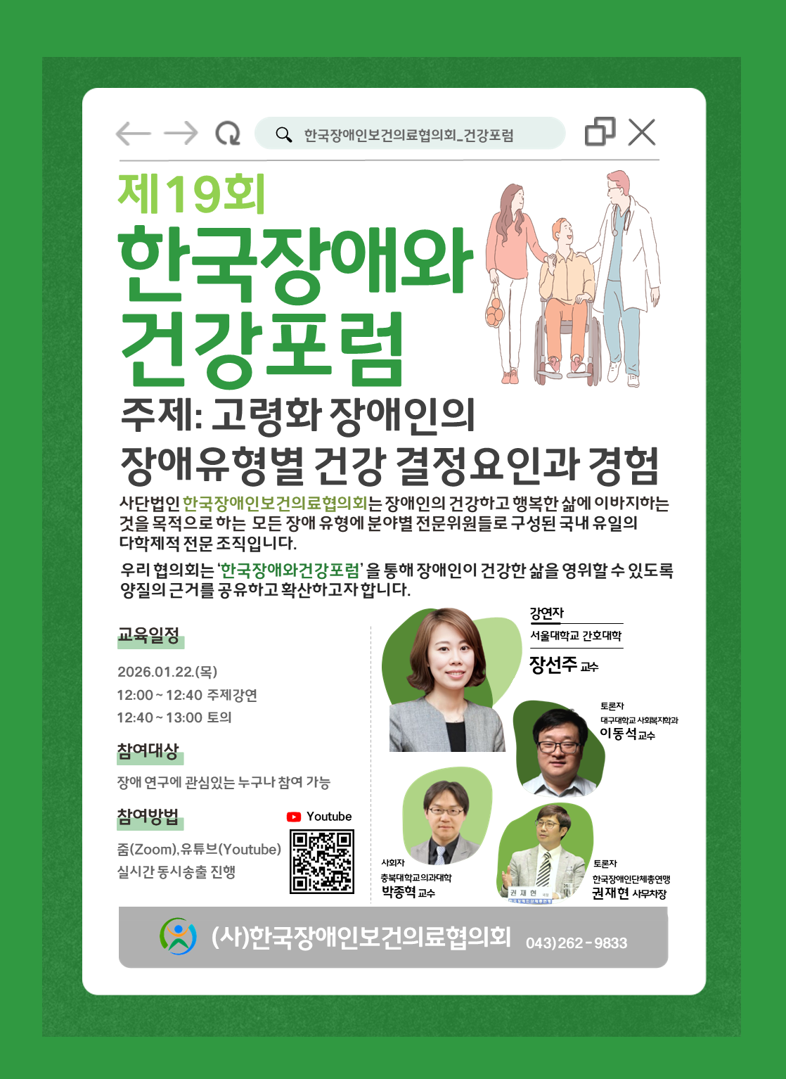 학회공지 [한국장애인보건의료협의회] 제19회 한국장애와 건강포럼 개최 안내 작성자 : 대한결핵 및 호흡기학회 조회수 : 14 게시일 : 2026-01-22 * 줌(zoom): 주제: 고령화 장애인의 장애유형별 건강 결정요인과 경험 시간: 2026년 1월 22일 (목) 오후 12시 [링크] 한국장애와건강포럼 참여하기 ☜ 클릭하면 줌 회의로 접속회의 ID: 859 1875 1258 암호: 610474 * 한국장애인보건의료협의회 공식 유튜브 채널: [유튜브] 한국장애인보건의료협의회 공식 채널 방문하기 목록