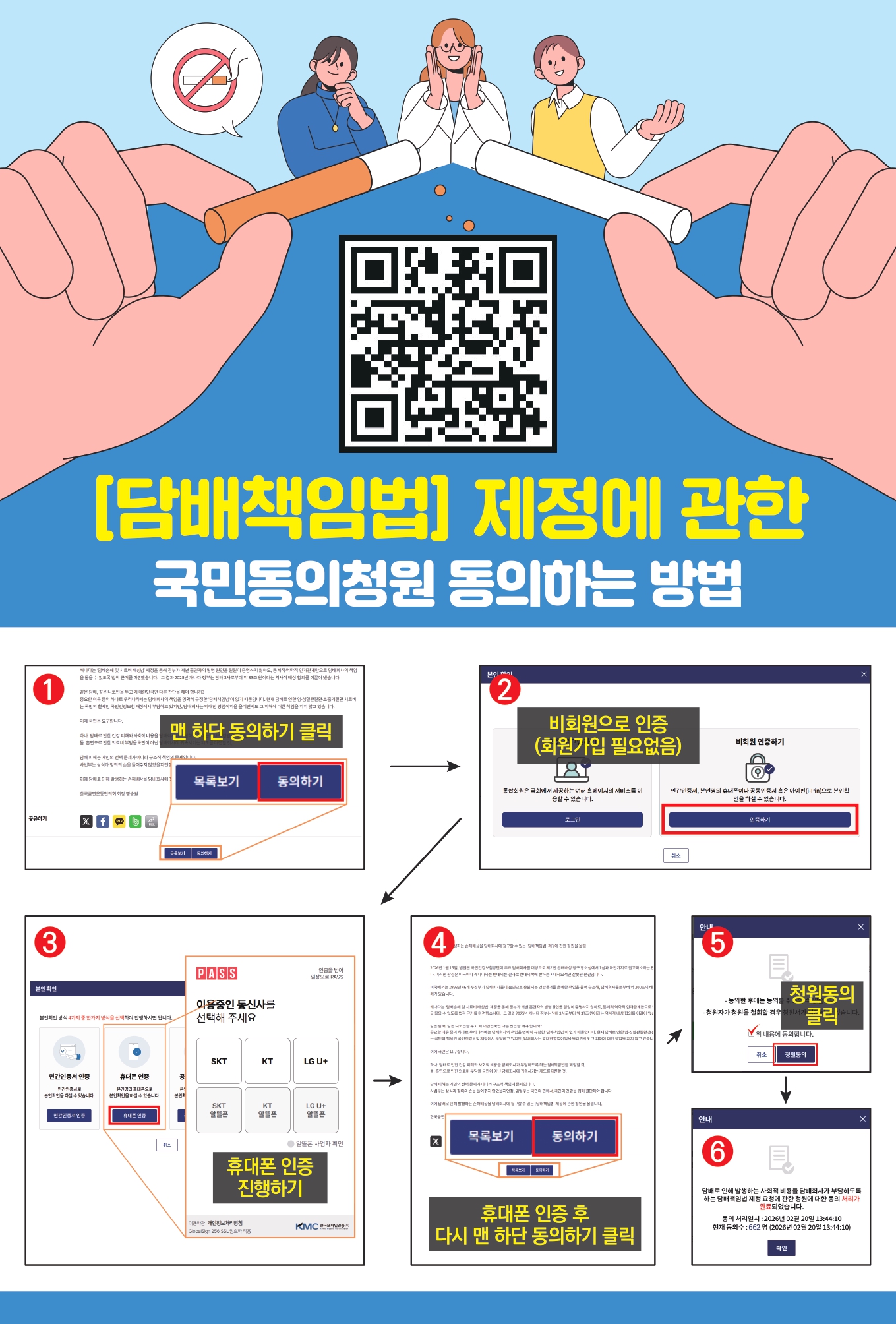 학회공지 [범국민흡연폐해대책단] 담배책임법 제정 관련 국민동의청원 참여 요청 작성자 : 대한결핵 및 호흡기학회 조회수 : 54 게시일 : 2026-02-26 국민건강보험공단에서는 한국금연운동협의회에서 추진 중인 「담배로 인해 발생하는 손해배상을 담배회사에 청구할 수 있는 담배 책임법 제정」 국민동의청원의 취지에 깊이 공감하며, 본 청원이 사회적 공론화와 제도 개선으로 이어질 수 있도록 학회 차원의 적극적인 참여와 홍보를 요청하였습니다. 이에 아래와 같이 안내드리오니 학회원 여러분의 많은 참여 바랍니다. 담배책임법 국민청원동의 응원영상.mp4 (다운로드 : 15회) 목록