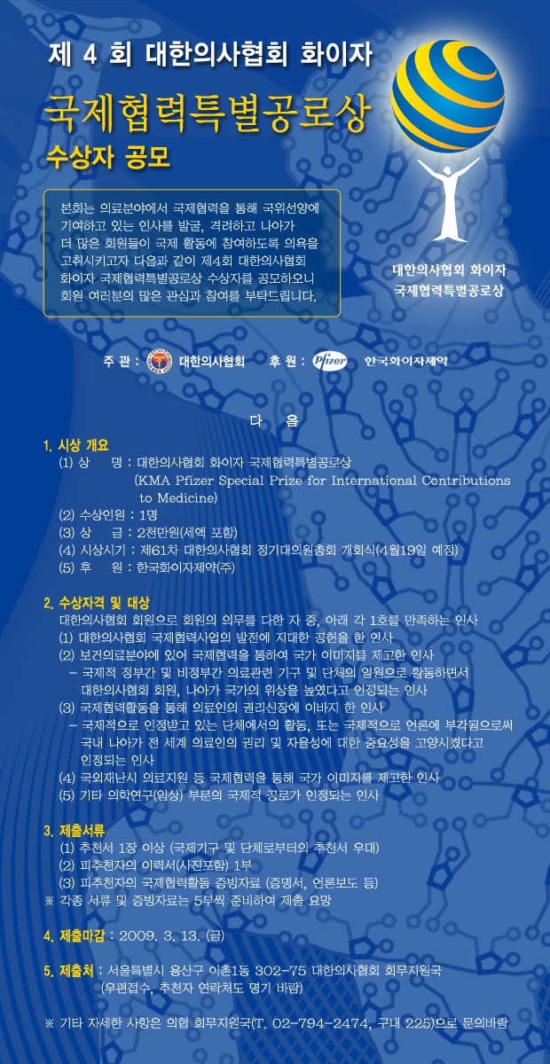 학회공지 제4회 대한의사협회 화이자 국제협력특별공로상 홍보 작성자 : 관리자 조회수 : 1,858 게시일 : 2009-02-17 . 1234853873_popup_all[1].JPG (다운로드 : 68회) 1234853873_특별공로상 홍보협조요청_시행문.pdf (다운로드 : 79회) 1234853873_공고문_final[1].hwp (다운로드 : 68회) 목록