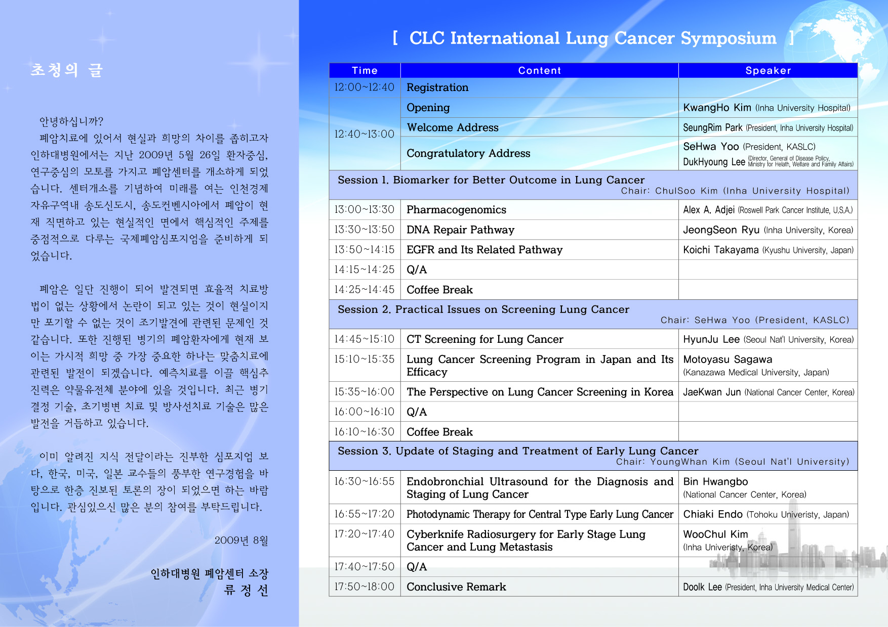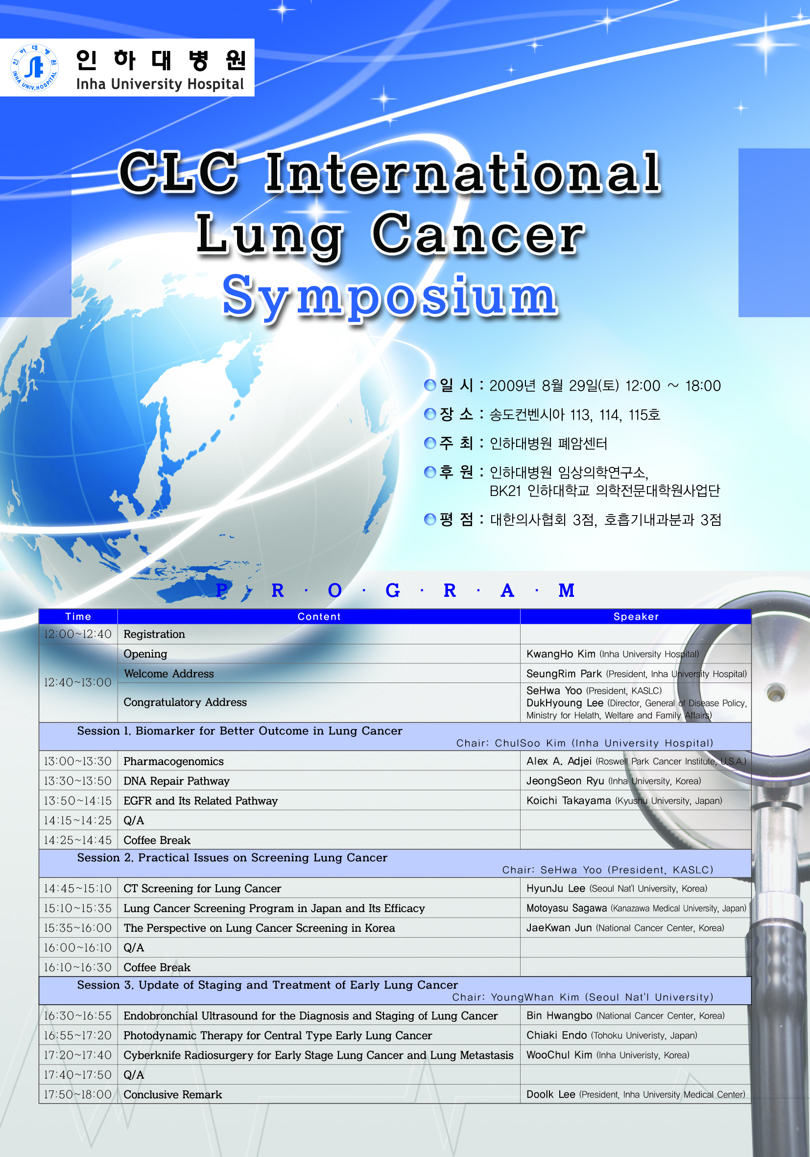 폐암치료에 있어서 현실과 희만의 차이를 좁히고자 인하대병원에서는 지난 2009년 5월 26일 환자중심, 연구중심의 모토를 가지고 폐암센터를 개소하게 되었습니다. 센터개소를 기념하여 미래를 여는 인천경제자유구역내 송도신도시, 송도컨벤시아에서 폐암이 현재 직면하고 있는 현실적인 면에서 핵심적인 주제를 중점적으로 다루는 국제폐암심포지엄을 준비하게 되었습니다.