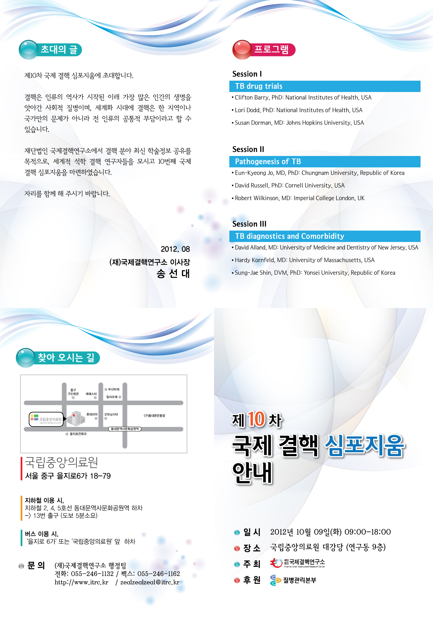 학회공지 국제결핵연구소 제10차 국제 결핵 심포지엄 개최 안내 작성자 : 관리자 조회수 : 1,062 게시일 : 2012-08-20 . 1345428091_초청장.jpg (다운로드 : 64회) 목록