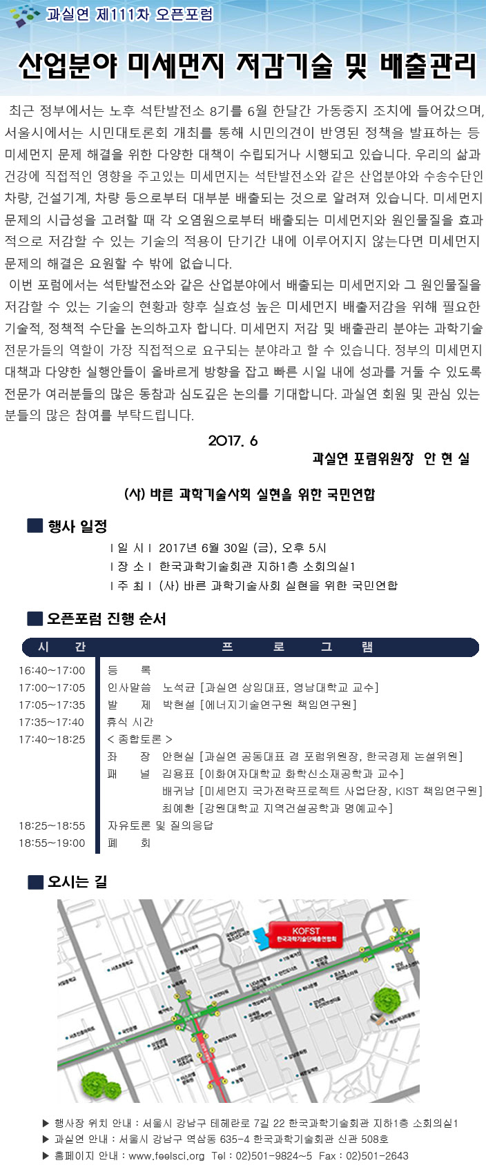 2017년 6월 30일(금) 오후 5시 [과실연 제111차 오픈포럼]을 개최하오며,