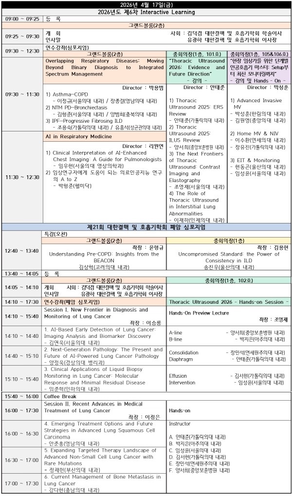 국내외 일정 학회 제21회 폐암 심포지엄/2026년도 제6차 Interactive Learning 행사 일자 : 2026-04-17 행사 장소 : DCC 대전컨벤션센터 홈페이지 : https://lungkorea.org/workshop/spring2026/ 목록