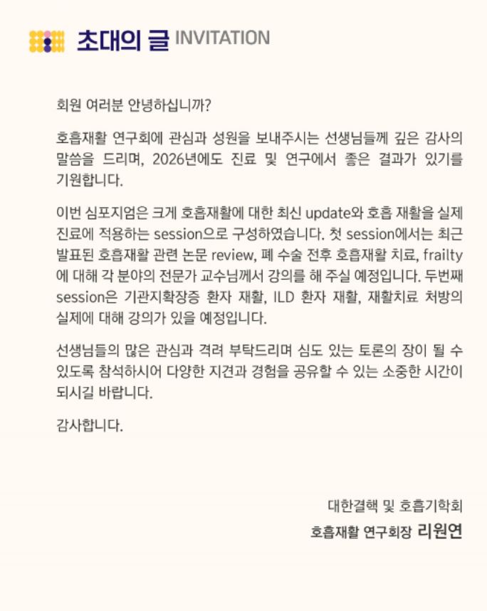 예정된 학술행사 2026 호흡재활연구회 심포지엄 일시 : 2026.04.04 (토) 장소 : 건국대학교병원 지하 3층 대강당 종합 안내 종합 안내 초대의 글 행사 일정 사전등록 및 등록확인 오시는 길